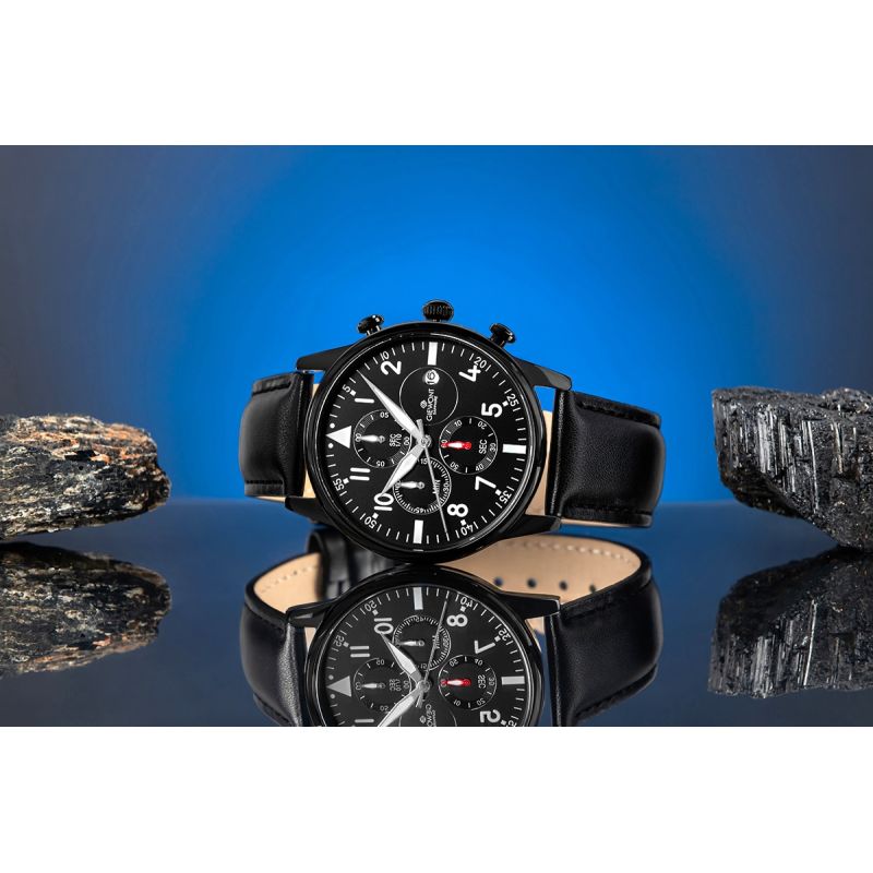 The Giewont GW5630-A1 men's watch is a perfect blend of aviator styling, functionality, and modern appeal, designed for the man who seeks more than just timekeeping in a watch. The easy-to-read dial, with its distinctive pilot-style layout, attracts the eye with its large Arabic numerals and perfectly placed chronograph subdials, adding technical sophistication and highlighting the model's dynamic character. Sapphire crystal provides spectacular clarity and exceptional scratch resistance, ensuring the watch maintains its impeccable appearance and high-quality presence for years to come.