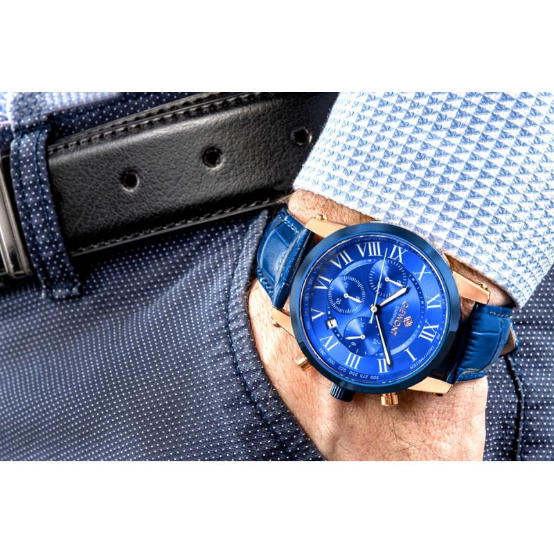 The Giewont GW6260-A5 men's watch is a model created for the man who values timeless elegance, refined form, and classic style that defies passing trends. The blue dial with its distinct Roman numeral indices and harmonious arrangement of chronograph subdials lends the watch a refined, balanced character that perfectly reflects the aesthetics of classic watchmaking. Every detail has been designed with readability and aesthetic coherence in mind, giving the watch a remarkably elegant and professional appearance.
