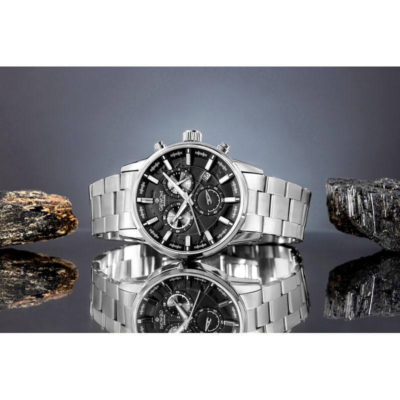 The Giewont GW4580-B2 men's watch is a perfect choice for men who value modern design, precise functionality, and a distinctive character. Its multi-dimensional dial with subtle embossing and subdials attract the eye and lend the model depth and exceptional elegance. Distinct metallic indices and massive hands ensure excellent readability, while the protective sapphire crystal guarantees impressive scratch resistance and a flawless appearance for years to come. The solid steel bracelet with distinctive links has a prestigious and modern look, and its ergonomic design fits perfectly on the wrist, ensuring comfort and confidence. The chronograph adds a sporty elegance and functionality to the watch, making it ideal for both everyday use and more demanding activities. The presence of a date display enhances the model's practicality, emphasizing its utilitarian yet luxurious character. This Giewont model is the choice of a self-confident man, conscious of style and quality - a watch that stands out from a distance, and up close delights with its precision of workmanship, expressiveness and timeless elegance.