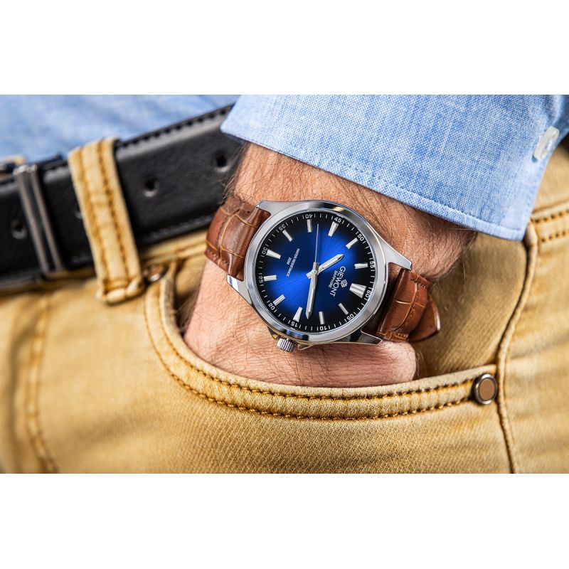 The GIEWONT Elegance Sapphire is a watch created for men who value impeccable style, high-quality craftsmanship, and details that demonstrate good taste. Its deep, navy blue dial with a subtle, radiant gradient immediately catches the eye and lends the watch a unique, prestigious character. Scratch-resistant sapphire crystal ensures the timepiece will retain its impeccable appearance for many years of intensive use. Precise, metallic indices and slim hands ensure excellent readability even in difficult lighting conditions, while emphasizing the watch's elegant character. The solid, shiny silver case harmoniously complements the soft, classic leather strap, which fits perfectly on the wrist and makes wearing the watch a pure pleasure. This versatile, timeless model is perfect for business meetings, formal events, and everyday wear, adding confidence and sophistication. GIEWONT Elegance Sapphire is not just a stylish accessory – it is a symbol of elegance, attention to detail and a conscious choice of a man who knows what he expects from his time and his style.