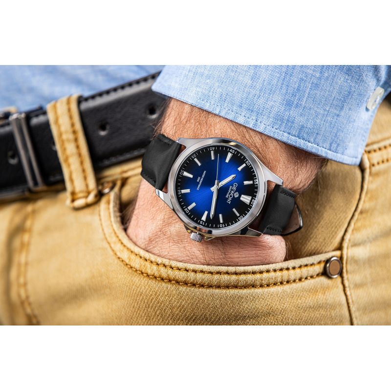 The GIEWONT Elegance Sapphire is a watch created for men who value impeccable style, high-quality craftsmanship, and details that demonstrate good taste. Its deep, navy blue dial with a subtle, radiant gradient immediately catches the eye and lends the watch a unique, prestigious character. Scratch-resistant sapphire crystal ensures the timepiece will retain its impeccable appearance for many years of intensive use. Precise, metallic indices and slim hands ensure excellent readability even in difficult lighting conditions, while emphasizing the watch's elegant character. The solid, shiny silver case harmoniously complements the soft, classic leather strap, which fits perfectly on the wrist and makes wearing the watch a pure pleasure. This versatile, timeless model is perfect for business meetings, formal events, and everyday wear, adding confidence and sophistication. GIEWONT Elegance Sapphire is not just a stylish accessory – it is a symbol of elegance, attention to detail and a conscious choice of a man who knows what he expects from his time and his style.
