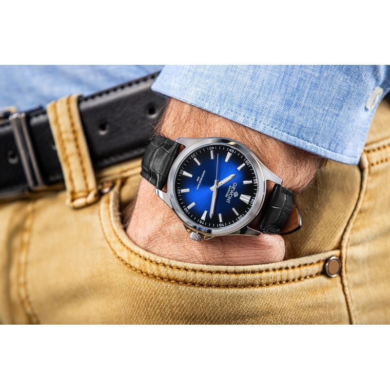 The GIEWONT Elegance Sapphire is a watch created for men who value impeccable style, high-quality craftsmanship, and details that demonstrate good taste. Its deep, navy blue dial with a subtle, radiant gradient immediately catches the eye and lends the watch a unique, prestigious character. Scratch-resistant sapphire crystal ensures the timepiece will retain its impeccable appearance for many years of intensive use. Precise, metallic indices and slim hands ensure excellent readability even in difficult lighting conditions, while emphasizing the watch's elegant character. The solid, shiny silver case harmoniously complements the soft, classic leather strap, which fits perfectly on the wrist and makes wearing the watch a pure pleasure. This versatile, timeless model is perfect for business meetings, formal events, and everyday wear, adding confidence and sophistication. GIEWONT Elegance Sapphire is not just a stylish accessory – it is a symbol of elegance, attention to detail and a conscious choice of a man who knows what he expects from his time and his style.
