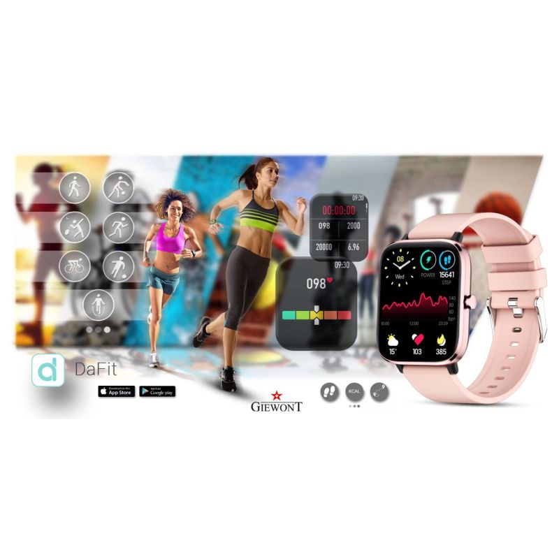 The Giewont GW230-1 smartwatch with an elegant pink finish is the perfect choice for those who value subtle style combined with modern functionality. Its delicate colors and carefully designed case give it a feminine, sophisticated character, making it a perfect complement to both everyday outfits and more elegant ensembles. The clear display ensures comfortable operation, and the intuitive menu allows you to quickly find all the most important functions. The smartwatch supports the user in maintaining their health and activity, allowing them to monitor their heart rate, sleep quality, steps, and calories burned. Smartphone notifications allow you to stay up to date without having to reach for your smartphone. The device also features an alarm clock and alarm function, making it a practical element of daily organization. A gentle vibration will subtly wake you up or remind you of important tasks. Additionally, the smartwatch allows you to make calls directly from your wrist thanks to the built-in microphone and speaker, providing convenience when your phone is not at hand. The Giewont GW230-1 is a combination of elegance, comfort, and modern features, the perfect companion for those who want to emphasize their style while using smart solutions every day.