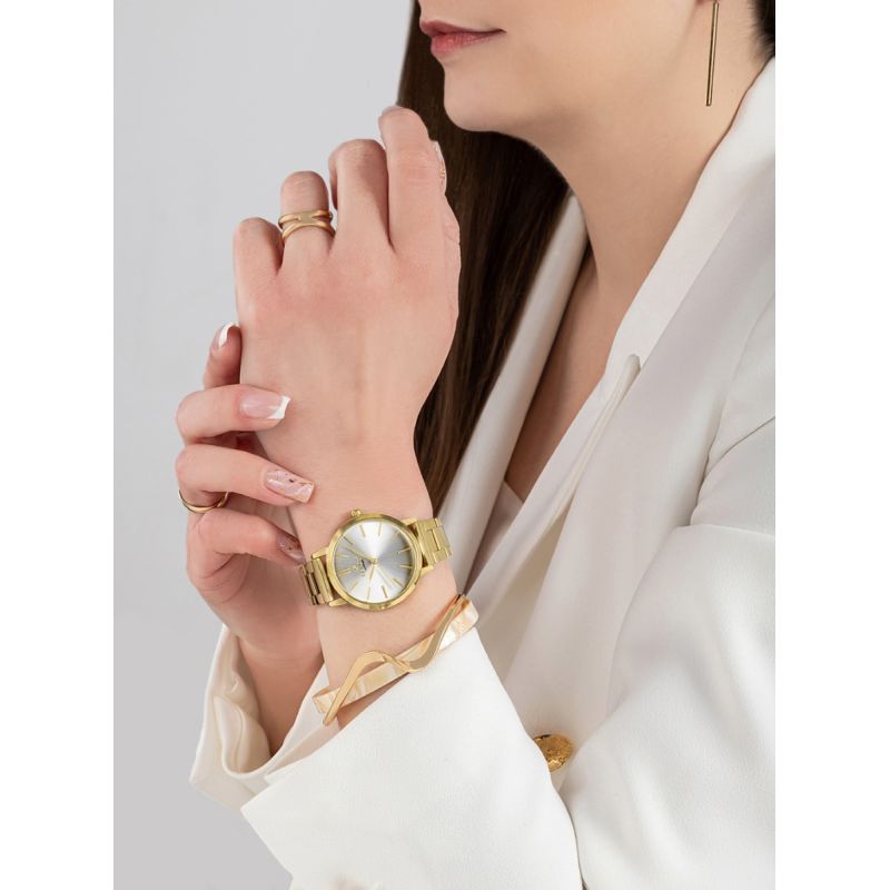 The strong bracelet, crafted from impeccably stainless steel, is a striking feature. Each link has been designed to fit perfectly on the wrist, ensuring maximum comfort. Understated, with a refined feel, refined, and robust, it's like a steel band that holds the watch firmly on your wrist, reminding you of its stability. Each link is meticulously crafted, making it a perfect match for both casual and formal wear. The precisely crafted clasp complements the watch's strong, feminine character.