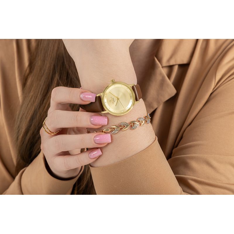 A carefully crafted genuine leather strap elegantly complements this women's watch, emphasizing its subtle and feminine character. The soft, pleasant-to-the-touch leather gently drapes over the wrist, ensuring all-day comfort. This element harmoniously complements the overall design, adding class and sophistication to the watch.