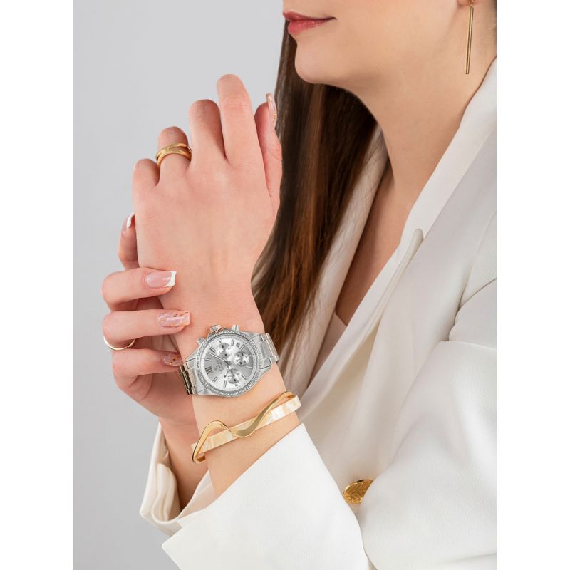 The strong bracelet, crafted from impeccably stainless steel, is a striking feature. Each link has been designed to fit perfectly on the wrist, ensuring maximum comfort. Understated, with a refined feel, refined, and robust, it's like a steel band that holds the watch firmly on your wrist, reminding you of its stability. Each link is meticulously crafted, making it a perfect match for both casual and formal wear. The precisely crafted clasp complements the watch's strong, feminine character.