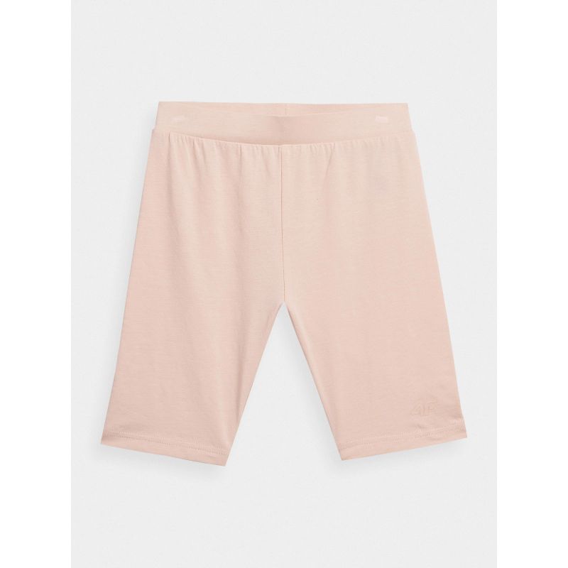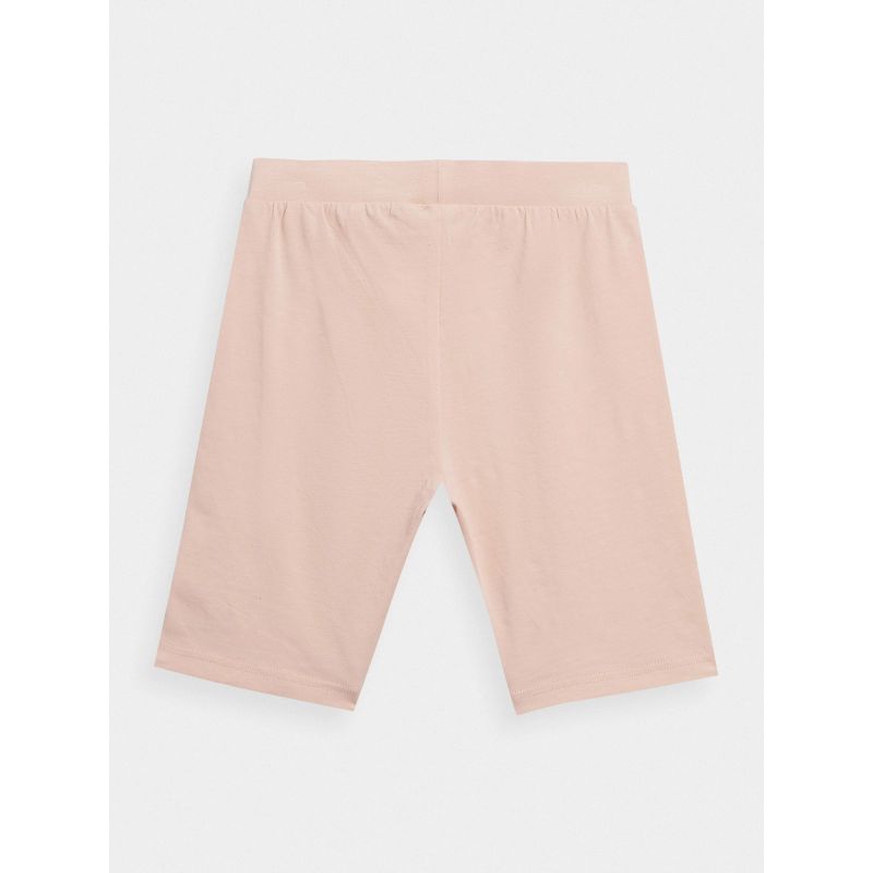 Girls' short leggings are the perfect addition to any casual or sporty outfit. These leggings are designed to fit snugly and contour to the body. The single jersey knit provides stretch and comfort, while a smooth finish on one side ensures a low rise and a biker cut. Made of 95% cotton, these girls' 4F leggings are not only soft and comfortable but also durable. They have no pockets, and the elastic waistband is non-adjustable. Additionally, flatlock seams prevent discomfort and irritation.