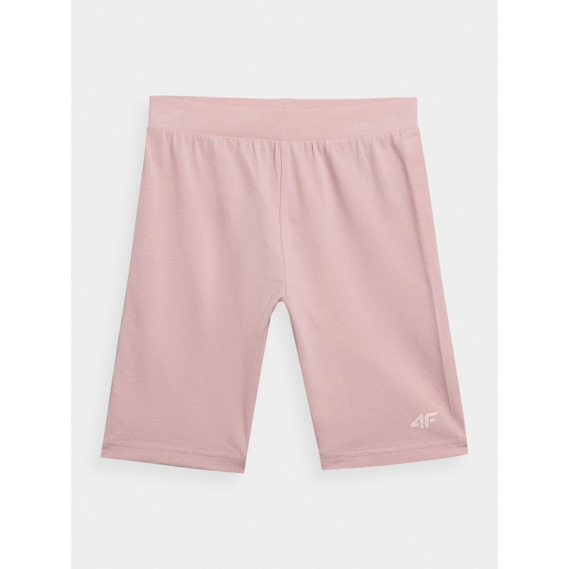 Girls' short leggings are the perfect addition to any casual or sporty outfit. These leggings are designed to fit snugly and contour to the body. The single jersey knit provides stretch and comfort, while a smooth finish on one side ensures a low rise and a biker cut. Made of 95% cotton, these girls' 4F leggings are not only soft and comfortable but also durable. They have no pockets, and the elastic waistband is non-adjustable. Additionally, flatlock seams prevent discomfort and irritation.