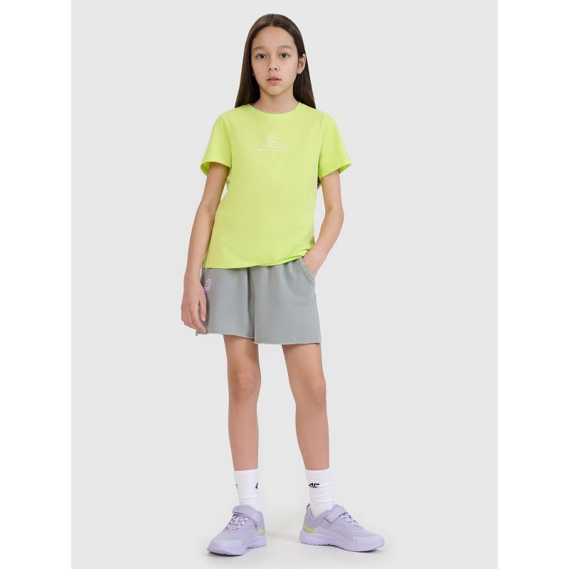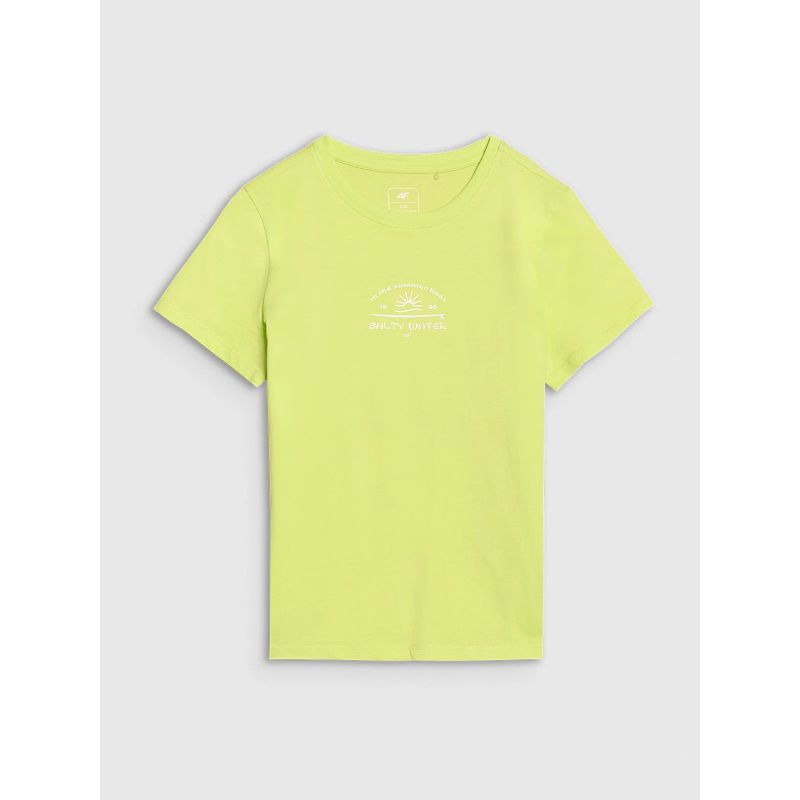This 4F girls' T-shirt is made of 100% cotton , ensuring comfort , durability , and a pleasant feel . The crew neckline is finished with a light rib, and the surfer print adds energy and summer style.