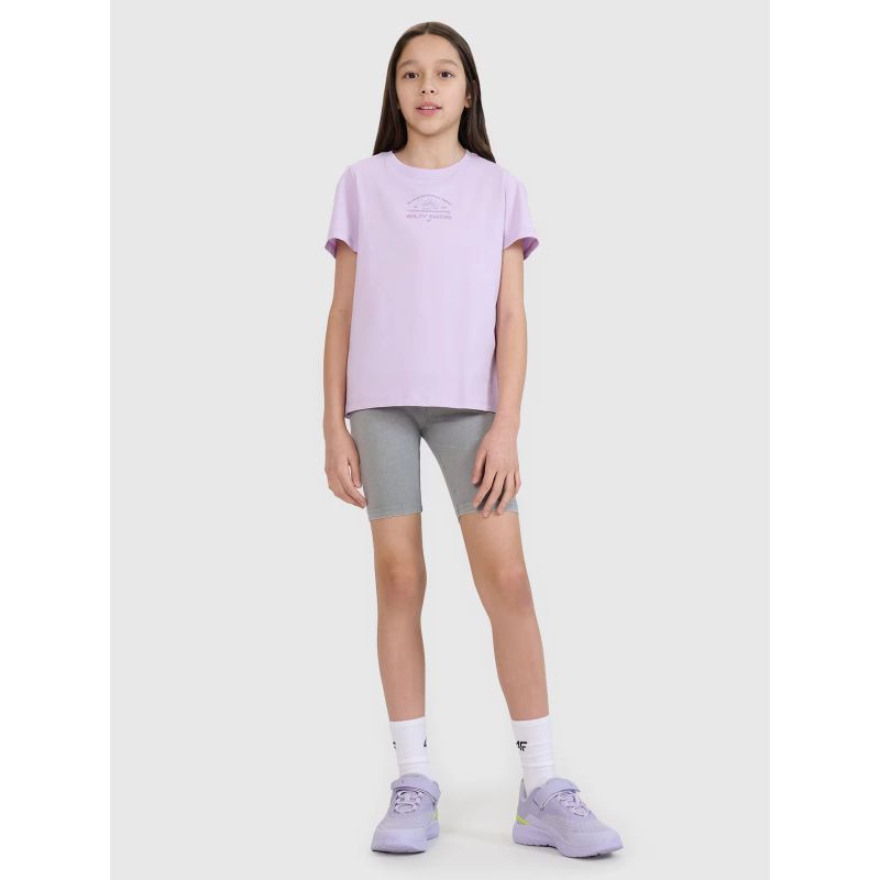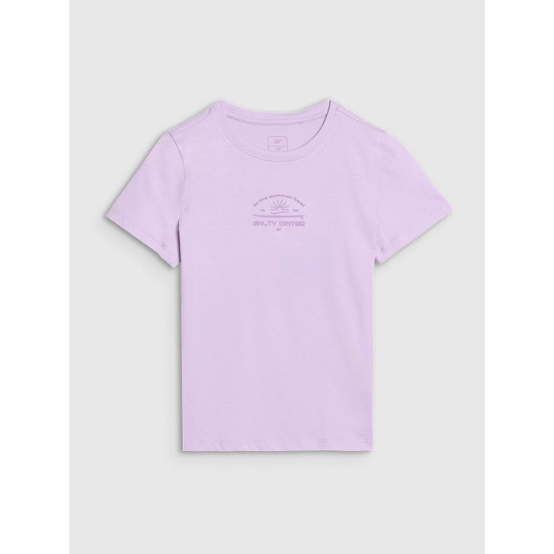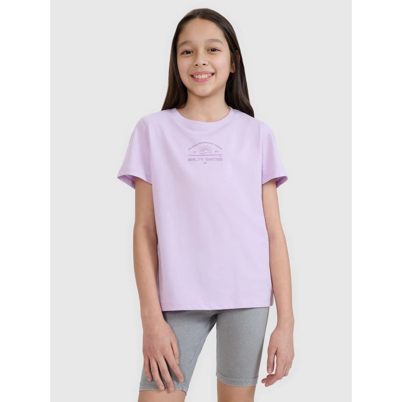 This 4F girls' T-shirt is made of 100% cotton , ensuring comfort , durability , and a pleasant feel . The crew neckline is finished with a light rib, and the surfer print adds energy and summer style.