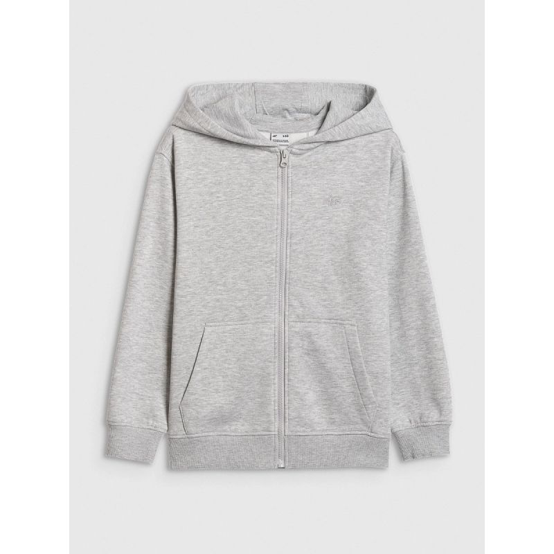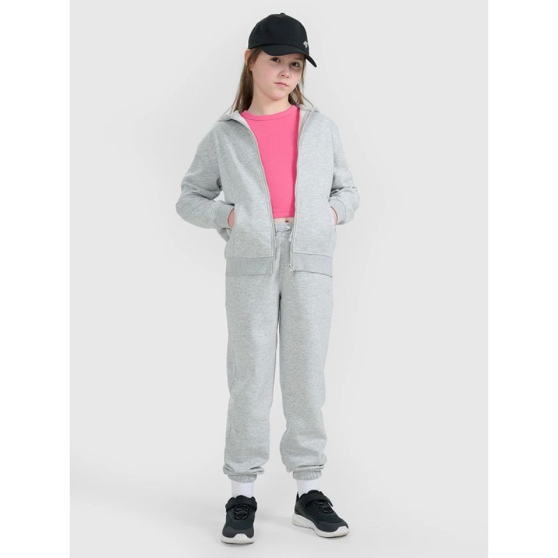 This 4F girls' full-zip sweatshirt is designed for everyday comfort and complete freedom of movement. The oversized cut provides a loose, comfortable fit, while the smooth single jersey fabric ensures stretch and comfort. Made of 79% cotton and 21% polyester , it combines softness, durability, and wear-resistance. A one-sided brushed interior provides extra warmth, making it perfect for cooler days. The integrated hood , ribbed cuffs and hem , and two open side pockets enhance functionality. Fastened with a one-way zipper , it's the perfect choice for everyday wear, school, or outdoor activities.