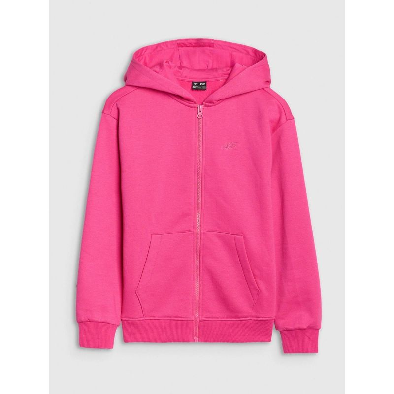 The 4F girls' zip-up hooded sweatshirt is a comfortable and versatile option, perfect for both everyday casual outfits and sports activities . The oversized cut drapes loosely on the body, ensuring freedom of movement and comfort, while the standard hip-length makes the sweatshirt practical and easy to pair with other wardrobe items. Made of soft single jersey fabric with a smooth surface, it is stretchy and pleasant to the touch. The average weight of 280 gsm ensures a good balance between lightness and thermal comfort. The one-sided brushed interior adds additional warmth, making the sweatshirt ideal for cooler days. The high cotton content (80%) guarantees natural comfort, while the addition of polyester (20%) increases durability and helps maintain its shape even with heavy use. Functional details such as an integrated hood , one-way zipper , two side pockets and elastic cuffs and hem make this model a practical choice for everyday wear.