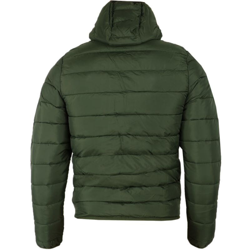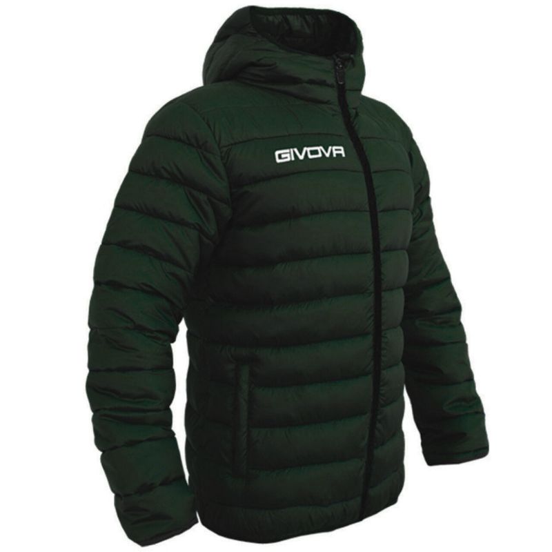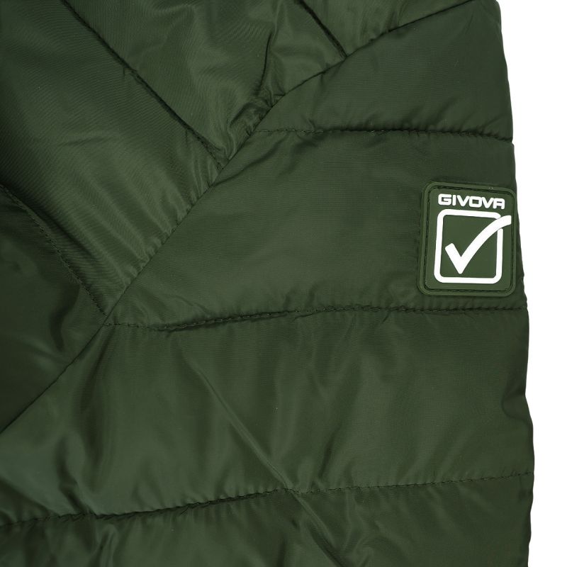 Givova Olanda Jacket, Green and Black G013 5110. The Givova Olanda Jacket is a transitional style that's lightweight and comfortable for chilly spring and autumn weather. Its quilted design with synthetic fill highlights the jacket's sporty style. Side open pockets and two internal pockets offer storage for valuables. The full-length zipper features a storm flap with a chin guard. Elastic trim at the cuffs, hood, and hem. Unisex. Material: 100% polyester