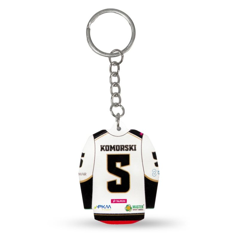 GKS Tychy Hockey Jersey Keychain (Home) Looking for a practical yet stylish gadget to show your support for the GKS Tychy team? This keychain in the shape of the club's hockey jersey is the perfect choice! It's not only a functional everyday item, but also a great souvenir that perfectly captures the team's spirit. Key features: Design: This keychain faithfully replicates the look of the official GKS Tychy away jersey, combining white with contrasting black sleeves. This design stands out for its elegance and classic style, immediately catching the eye. Distinctive GKS Tychy logo: On the front of the jersey, you'll find a large, recognizable GKS Tychy logo in a triangular shape, in green, red, and gold. It's a symbol of club pride and tradition that every hockey fan knows and appreciates. Number "5" on the back: The attention to detail is impressive – the number "5" on the back of the keychain is elegantly framed in gold, adding a professional touch to the jersey. Sponsor logos and the Tychy city coat of arms: This keychain not only captures the look of the jersey itself but also features important elements, such as sponsor logos and the Tychy city coat of arms, emphasizing the team's ties to the local community. Practicality and functionality: Thanks to its robust construction and compact size, this keychain is a perfect accessory for keys, a backpack, or a gym bag. It's a functional gadget that also allows you to demonstrate your daily devotion to your favorite team. This keychain, shaped like the GKS Tychy away jersey, is the perfect accessory for any loyal fan. It's not only practical but also exceptionally aesthetic – perfect for attaching to keys, a bag, or a backpack.