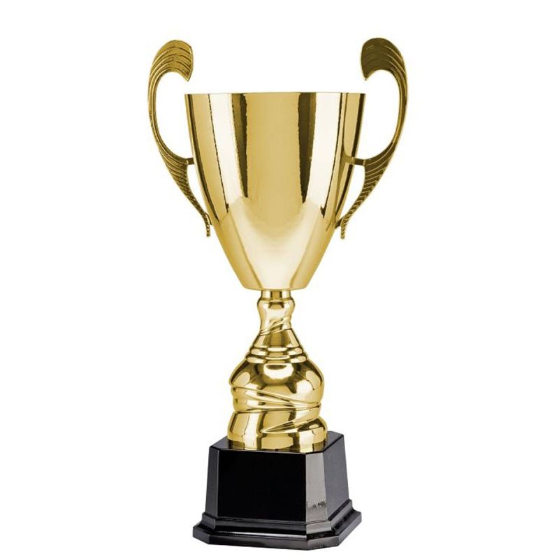 An elegant, shiny gold trophy made of high-quality, durable metal. A tall, wide goblet with comfortable handles. Perfect for prestigious sporting events.