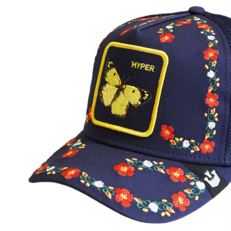 Navy blue trucker cap with a floral pattern and a Goorin Bros jacquard label on the visor.