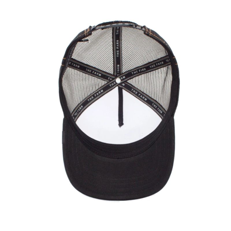 A black and white trucker cap with a Goorin Bros jacquard label on the visor.
