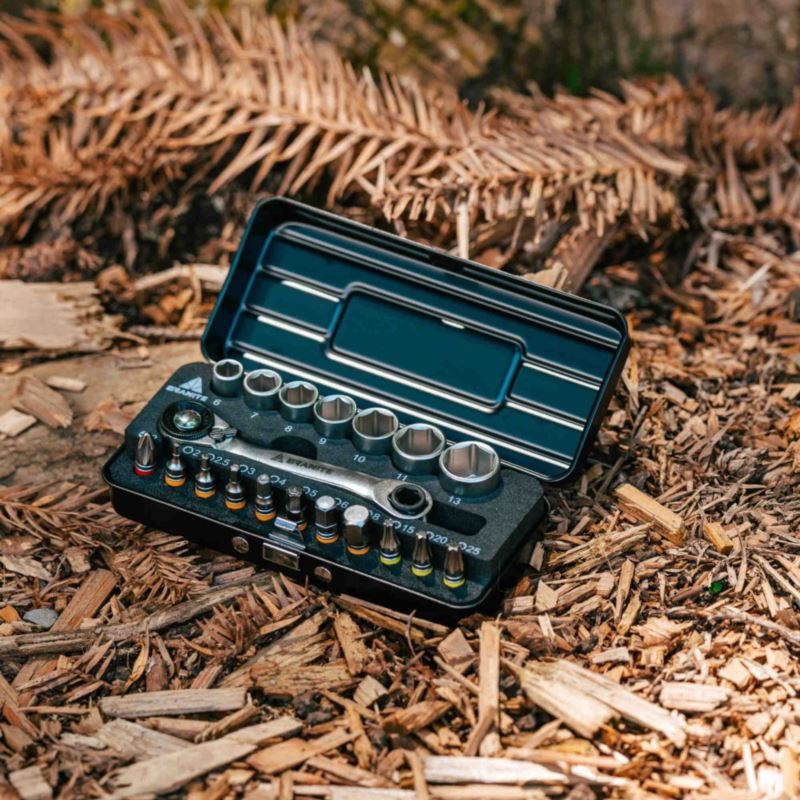 A compact, sturdy metal toolbox perfect for any task. Includes a double Allen bit and ratchet socket, 7 Allen sockets, and 11 precision bits, so you have the right tool for every job.