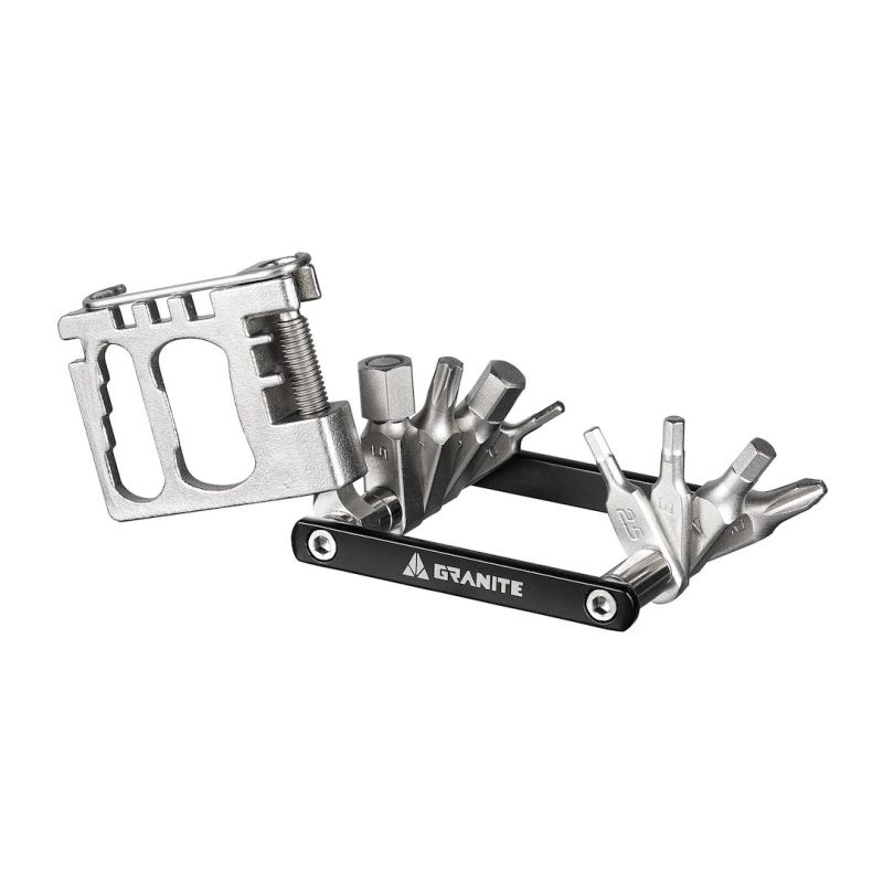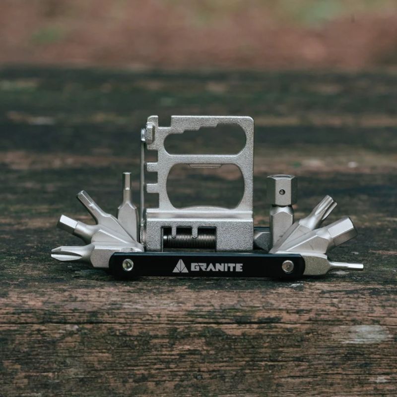 The Granite Diverse 20 packs maximum functionality into an impressively slim design—just 11mm thick. Weighing just 104g, this ultra-compact multi-tool is designed for cyclists who want versatility without the bulk. With 20 essential functions—including Allen bits (2 to 8mm), a T25, a PH2 screwdriver, a chain breaker and hook, spoke wrenches, socket wrenches, and even a bottle opener—it's a complete solution for trail repairs and on-the-go adjustments.
