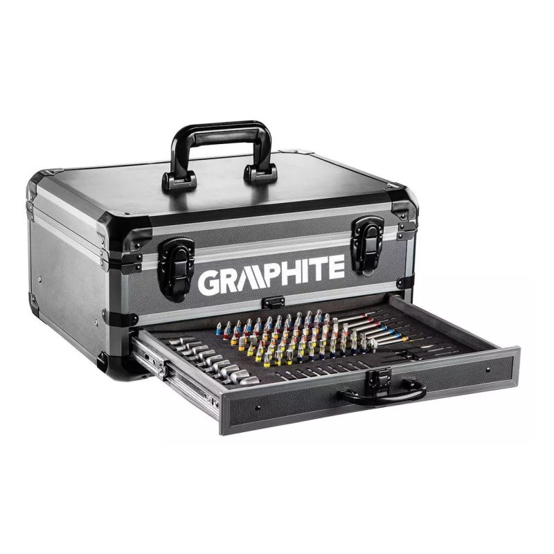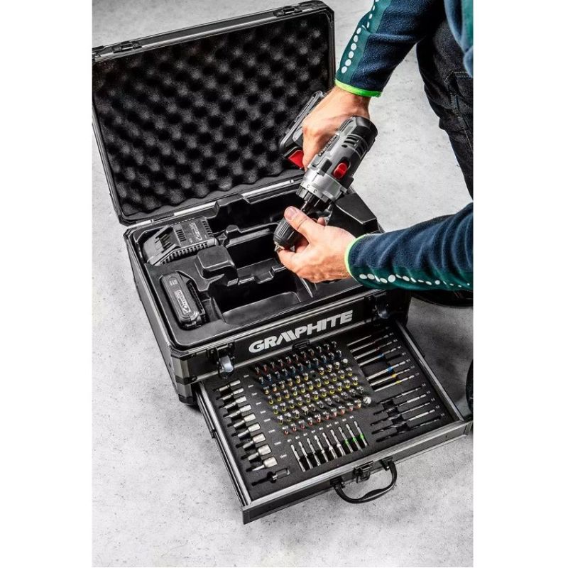 Graphite Energy+ set in an aluminum case: drill/driver with removable handle, 2 x 2.0Ah batteries, charger and 109 accessories