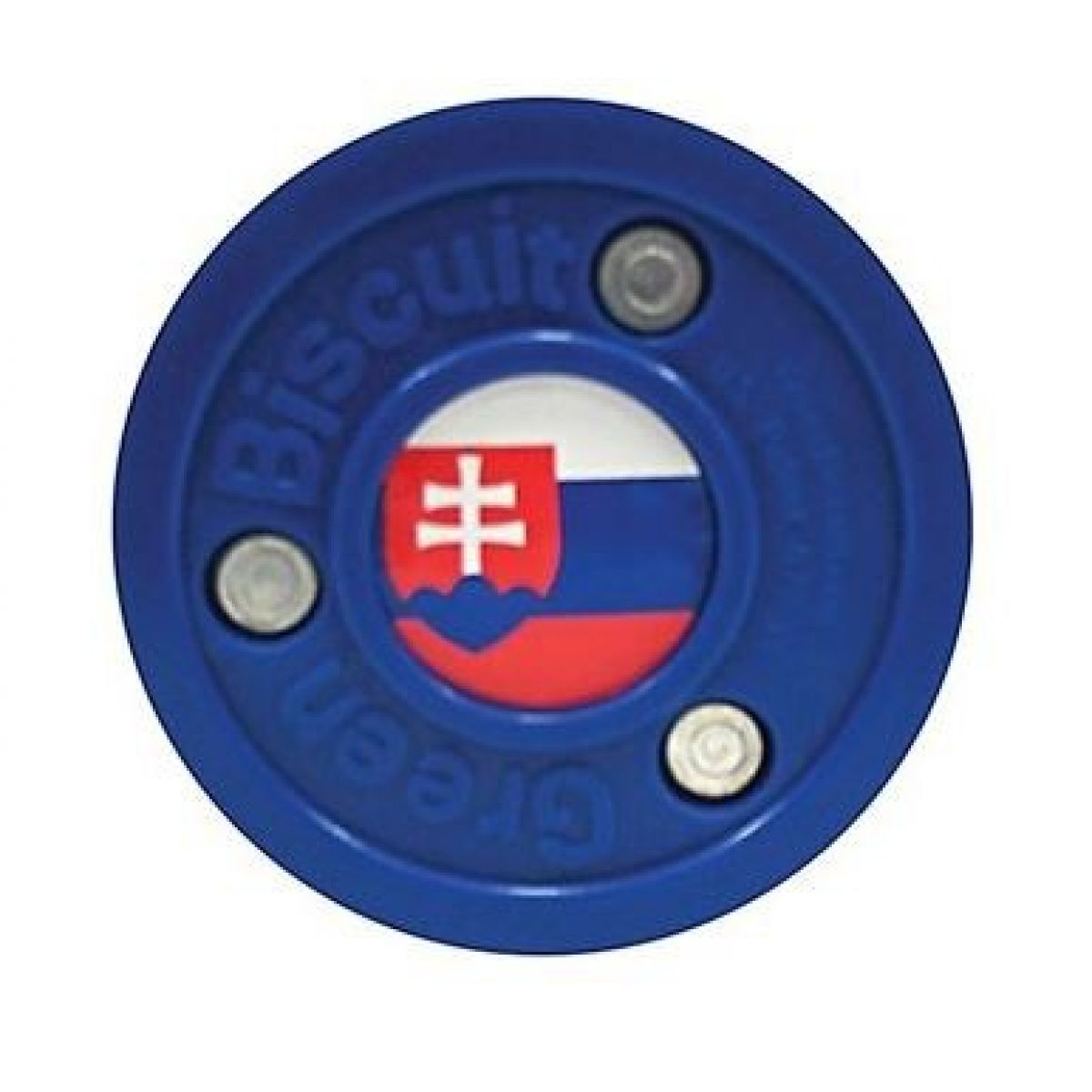 The Green Slovakia BlueSports Green Biscuit in-line hockey puck features the Slovakian national team colors. The Green Biscuit training puck features the Slovak flag in the center. The Green Biscuit puck's dimensions are the same as a hockey puck, but the Green Biscuit is lighter.