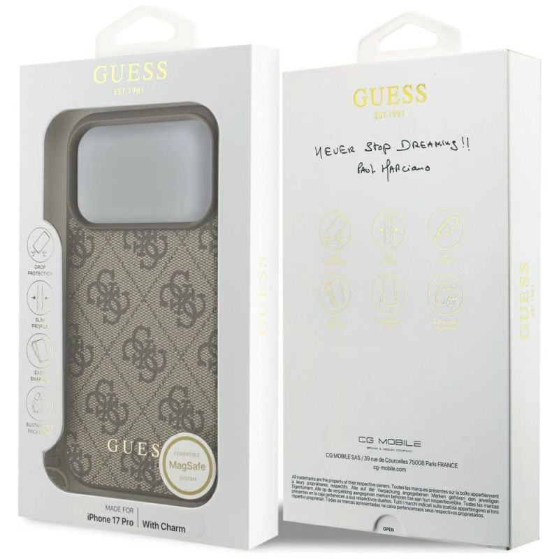 Brand Guess 4G Collection Charms Collection MagSafe Type Protective case Material TPU / PC / Eco-leather Color Brown Compatibility iPhone 17 Pro| Name | Details |