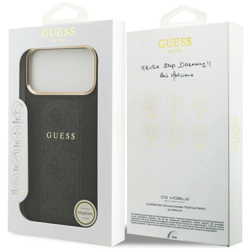 Mark Guess Collection 4G Stripe MagSafe Type Protective case Material TPU / PC / Eco-leather Color Black Compatibility iPhone 17 Pro Max| Name | Details |