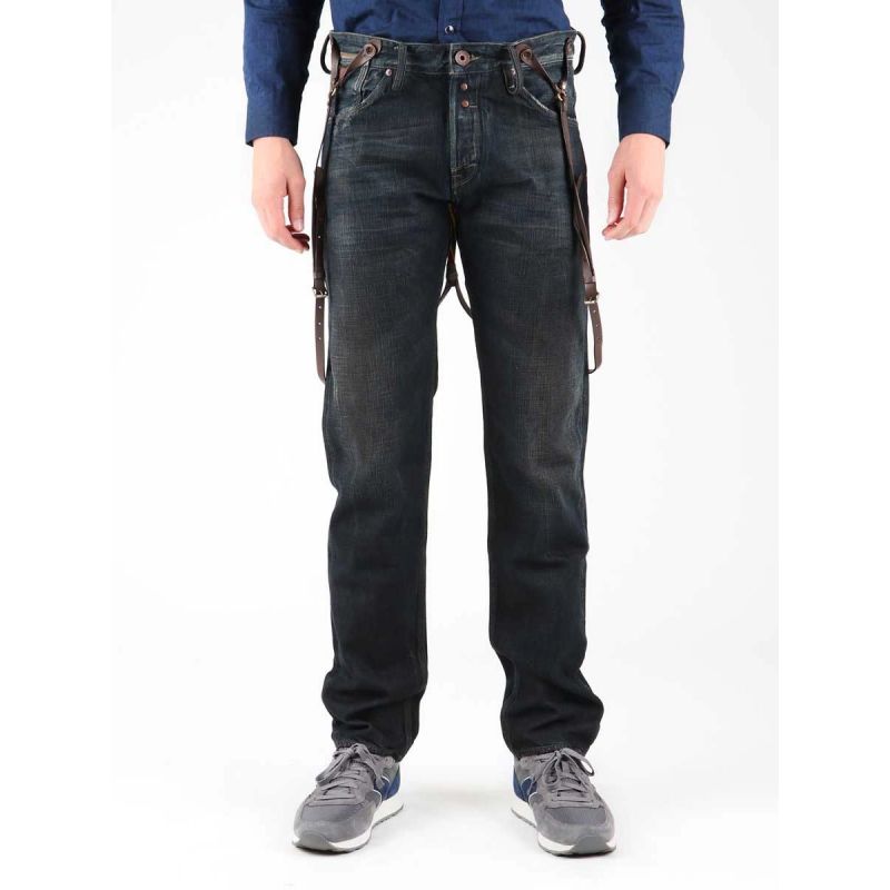 Men's jeans with a slightly tapered, wide leg. The trousers feature a button closure. Large pockets at the front and back. Guess leather logo at the back of the waistband. An interesting addition and finishing touch are the straps. Material: 100% cotton