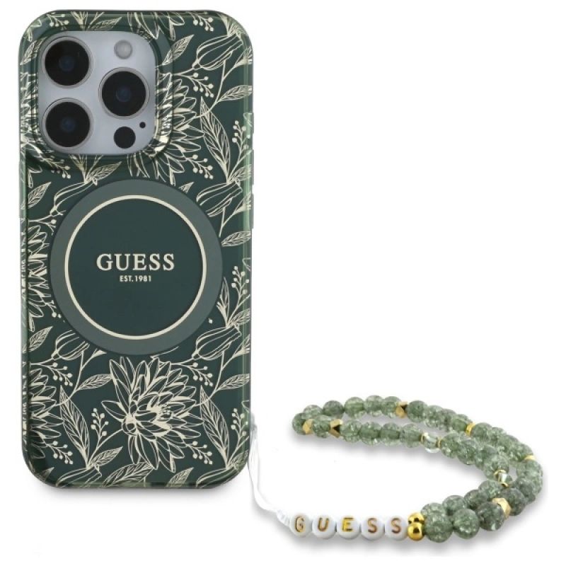 Guess IML Flowers Allover Electro With Pearl Strap MagSafe case for iPhone 16 Pro Max - green