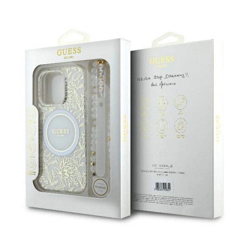 Guess IML Flowers Allover Electro With Pearl Strap MagSafe case for iPhone 16 Pro - white
