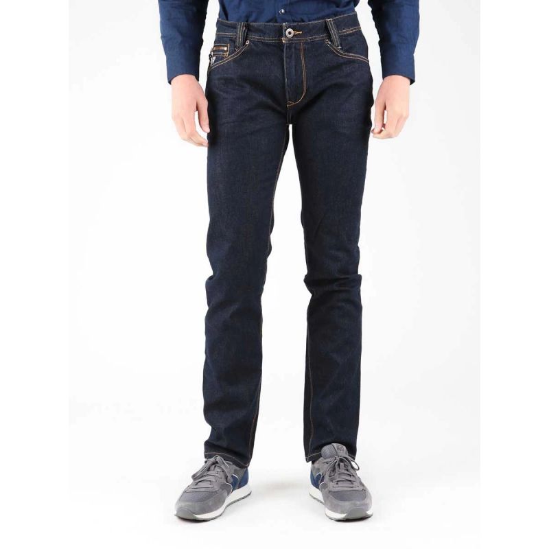 Men's straight-leg jeans with a zipper closure. Large front and back pockets. One small pocket on the front has a zipper closure and a decorative strap. Material: 99% cotton/1% elastane
