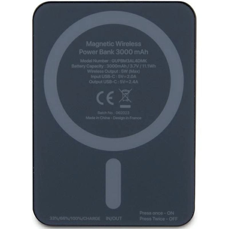 Collection Metal Script Logo MagSafe Type Wireless Power Bank Material Aluminum/Silicone Capacity 3000 mAh / 3.7V / 11.1Wh Dimensions 83x60x14 mm Wireless charging power 5W (Max) USB-C input 5V⎓2.0A USB-C output 5V⎓2.4A Power supply USB-C Color Black Included 1x Guess Metal Script Logo MagSafe Powerbank,1x USB-C cable 30cm