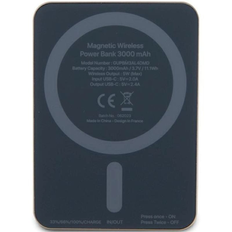 Collection Metal Script Logo MagSafe Type Wireless Power Bank Material Aluminum/Silicone Capacity 3000 mAh / 3.7V / 11.1Wh Dimensions 83x60x14 mm Wireless charging power 5W (Max) USB-C input 5V⎓2.0A USB-C output 5V⎓2.4A Power supply USB-C Color Golden Included 1x Guess Metal Script Logo MagSafe Powerbank,1x USB-C cable 30cm