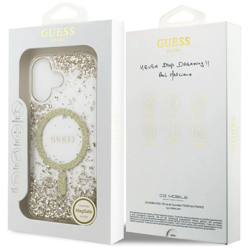 Mark Guess Collection Resin Bottom Glitter MagSafe Type Protective case Material TPU / PC Color Golden Compatibility iPhone 17| Name | Details |