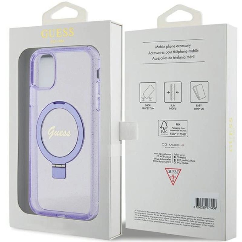 Guess Ring Stand Script Glitter MagSafe case for iPhone 11 / Xr - purple