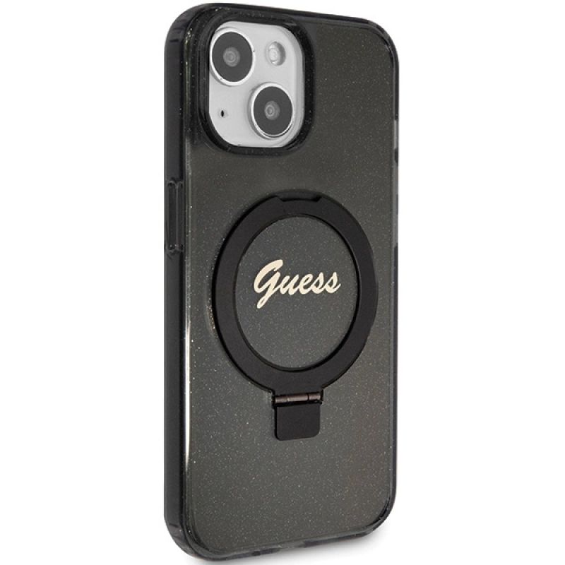 Guess Ring Stand Script Glitter MagSafe case for iPhone 13 / 14 / 15 - black