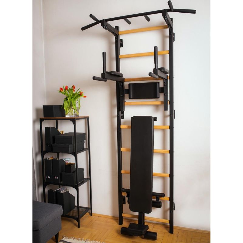 This gymnastics ladder with an adjustable bar and handrail is a model that perfectly complements Scandinavian interiors. The vertical profiles (40mm x 50mm) are made of high-quality, powder-coated metal. The rungs are made of oval-shaped beech, and their surface is hand-oiled, making it comfortable to use. The upper section of the ladder features a removable metal pull-up bar with six different handles, allowing you to develop your arm and back strength using various grips, such as a wide grip. This ladder was created for people who want to work on their physique in the comfort of their home. The ladder allows for a wide variety of exercises without taking up much space. The design was carefully considered to complement current interior design trends without disrupting the overall décor of the home. One adult can adjust the bar's height and position. If we rotate the pull-up bar, it will serve as a handle for the barbell.