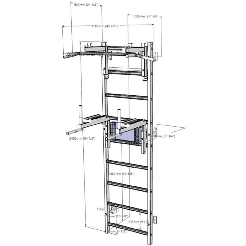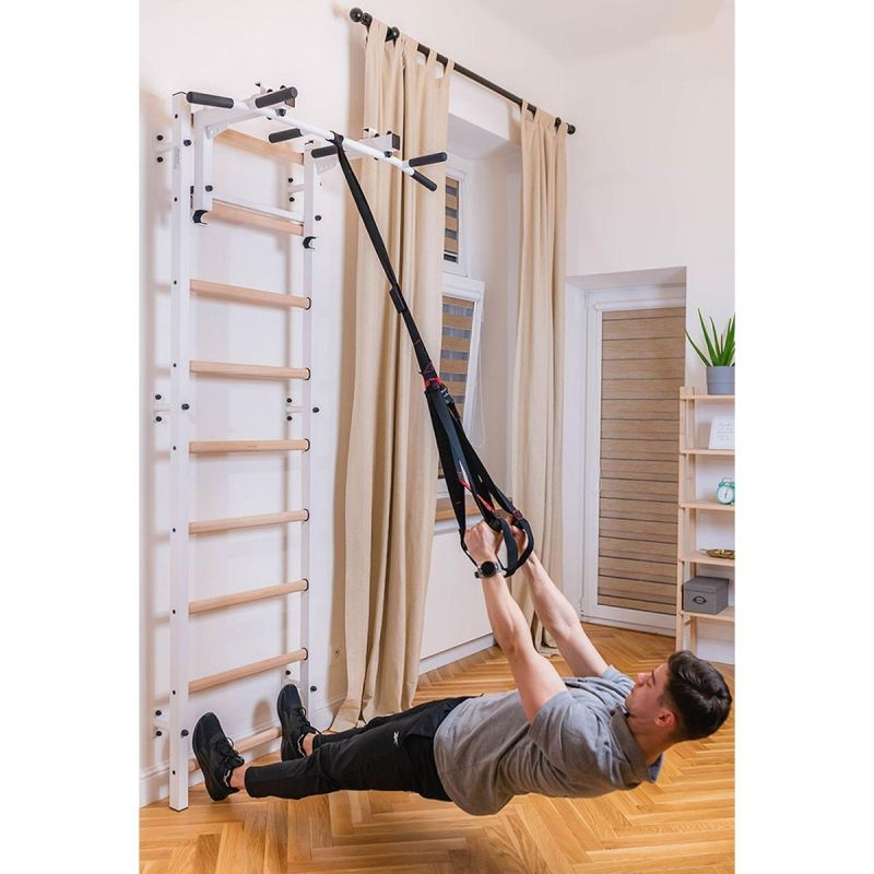 This gymnastics ladder with an adjustable bar and handrail is a model that perfectly complements Scandinavian interiors. The vertical profiles (40mm x 50mm) are made of high-quality, powder-coated metal. The rungs are made of oval-shaped beech, and their surface is hand-oiled, making it comfortable to use. The upper section of the ladder features a removable metal pull-up bar with six different handles, allowing you to develop your arm and back strength using various grips, such as a wide grip. This ladder was created for people who want to work on their physique in the comfort of their home. The ladder allows for a wide variety of exercises without taking up much space. The design was carefully considered to complement current interior design trends without disrupting the overall décor of the home. One adult can adjust the bar's height and position. If we rotate the pull-up bar, it will serve as a handle for the barbell.
