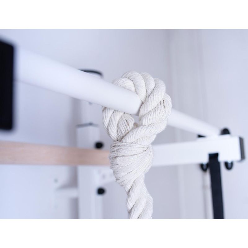 The gymnastic ladder is a stable structure designed for school-age children and their parents. The white color of the ladder, along with the natural beech wood rungs, creates a unique look. The natural and subdued color scheme makes it a perfect addition to a child's room. An additional advantage is the expansion mounting option, which does not require drilling into the wall. This multifunctional gymnastic ladder is made of metal profiles (50 mm x 40 mm) and hand-oiled beech wood rungs. Its advantage is the expansion mounting option (no drilling required). The uniform vertical side profiles are powder-coated white. The ladder is designed not only to enhance the room's decor but also to become an indispensable addition. Another advantage of the ladder is that it takes up virtually no space in the room. It is worth noting that the ladder is very durable and suitable for heavy loads. The maximum user weight is 150 kg. In addition to the ladder, the set includes a pull-up bar, gymnastic rings, and a rope swing. The ladder can be wall-mounted or suspended (floor-to-ceiling).