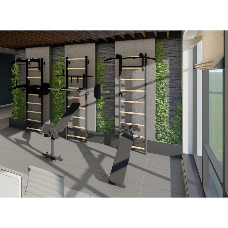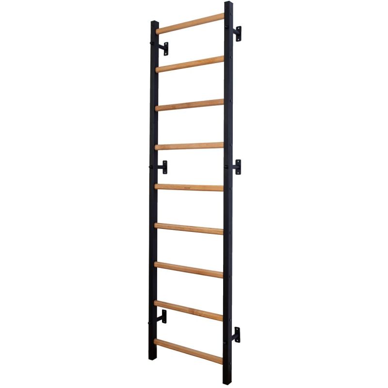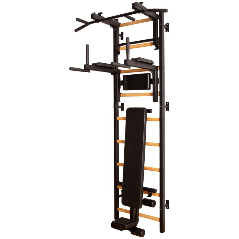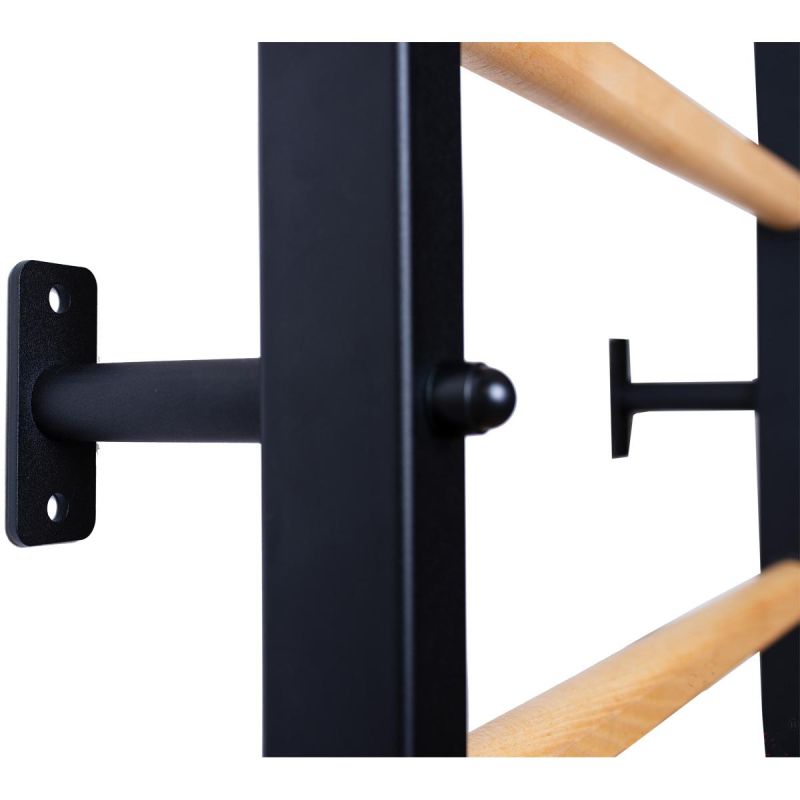 This gymnastics ladder with an adjustable bar, handrail, and bench is a model that perfectly complements Scandinavian interiors. The vertical profiles (40mm x 50mm) are made of high-quality, powder-coated metal. The rungs are made of oval-shaped beech, and their surface is hand-oiled, making the ladder comfortable to use. At the top of the ladder is a removable metal pull-up bar, equipped with six different handles that allow you to develop your arm and back strength using various grips, such as a wide grip. This ladder was created for people who want to work on their physique in the comfort of their home. The ladder allows for a wide variety of exercises without taking up much space. The design was carefully considered to complement current interior design trends without disrupting the overall décor of the home. One adult can adjust the bar's height and position. If we rotate the pull-up bar, it will serve as a handle for the barbell.