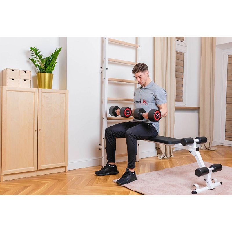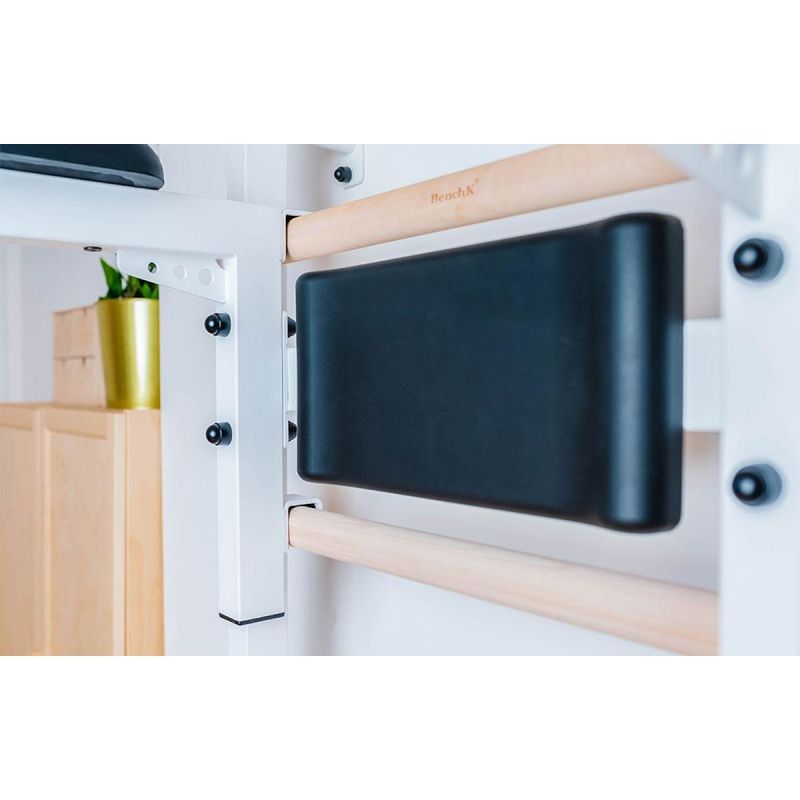 This wood and metal gymnastic wall bar with a horizontal bar, parallel bars, and bench is a sturdy and practical design. It doesn't take up much space, is wall-mounted and extends approximately 15 cm, making it an ideal addition to any room. The innovative combination of wood and metal perfectly complements current trends in modern interior design. The wall bar is mounted to the wall using six strong brackets. The side profiles of the gymnastic wall bar are made of 40 x 50 mm metal with a 2 mm thick steel. The metal used in production is high-quality, and the powder coating protects the profiles from chips, scratches, and scuffs resulting from use and contact with accessories. The T-shaped shock absorption of the wall brackets is designed to withstand heavy loads, up to 150 kg per person. The rungs are made of beechwood and are hand-oiled, preventing hand slippage during gymnastic wall bar exercises. This also protects the ladder from wear and tear, such as marks, abrasions, and dirt. The ladder's greatest advantage is its durability. It can withstand loads of up to 150 kilograms. This is especially important for heavier users.