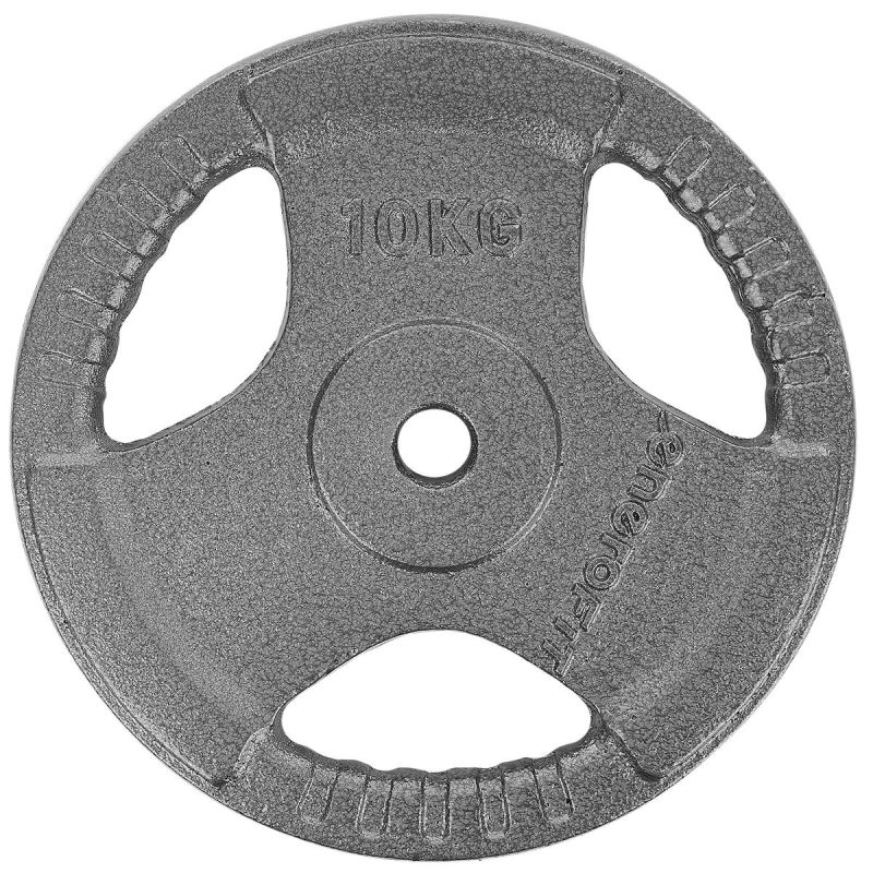 The ENERO FIT HAMMERTONE 10 KG WEIGHT PLATE (26.5 mm diameter) is a sturdy training plate made of cast iron and finished with a durable hammer-effect coating that increases resistance to corrosion and damage. Three ergonomic handles allow for quick, secure, and comfortable maneuvering during training or when changing plates on the bar. The universal 26.5 mm hole diameter allows for compatibility with most standard bars, dumbbells, and weight plates used in home gyms. This is an indispensable piece of exercise equipment for beginners and advanced users.