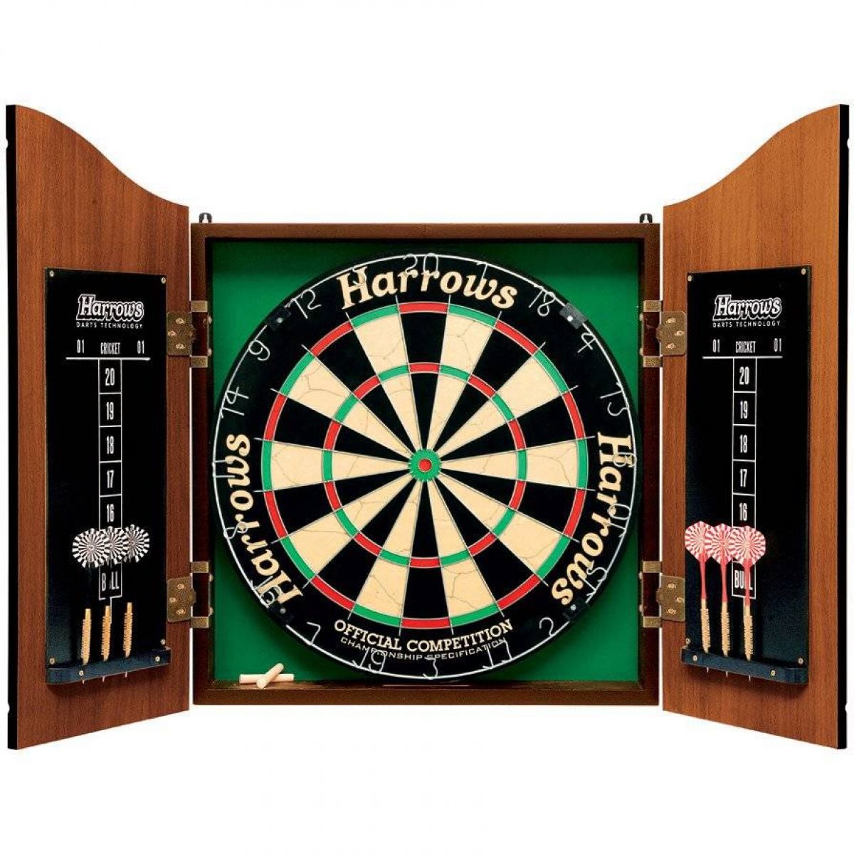 - A stylish wooden cabinet that houses a dartboard and two boards with chalk and a cloth for recording scores.