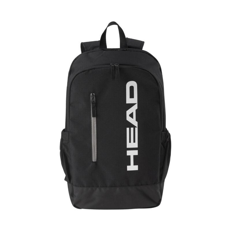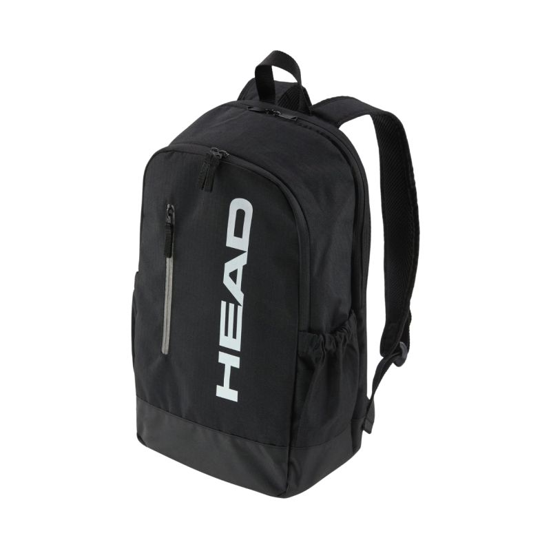 Head Base Backpack 17L Black 261235. Spacious and stylish Head tennis backpack. Racket compartment holds up to 2 rackets. Main compartment is large enough to hold a change of clothes. One small front zippered pocket. Two open side pockets. Mesh back panel for ventilation. Comfortable, padded, adjustable shoulder straps. Specifications: Material: 100% polyester. Capacity: 17L. Dimensions: 54 x 33 x 13 cm. Main compartment, compartment for 1-2 rackets, zippered front pocket, and two open side pockets.