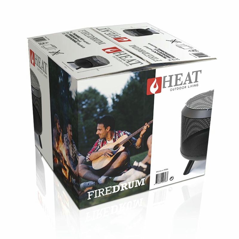 The Fire Drum garden fire pit by HEAT Outdoor Living is a modern, cylindrical fire pit inspired by the shape of a classic garden basket. Made of powder-coated steel and mounted on three sturdy metal legs, it combines attractive design with functionality. The distinctive, perforated bowl structure limits the spread of sparks and ensures safety, while also allowing for observation of the fire from all sides.