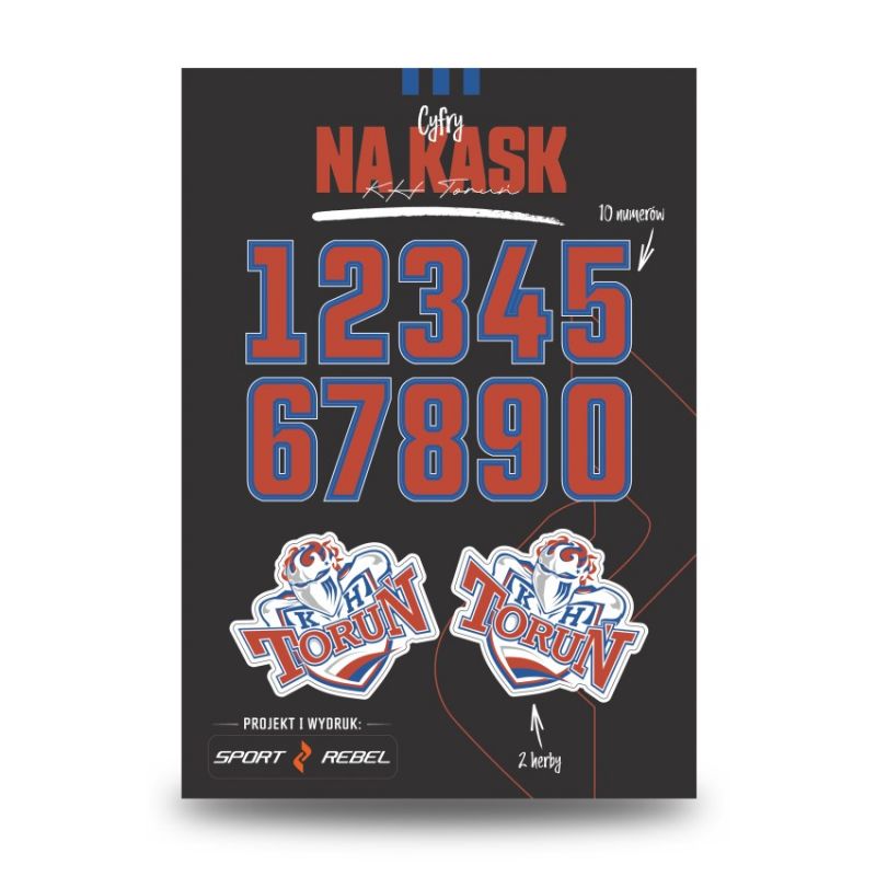 KHT Toruń Helmet Numbers. KHT Toruń Helmet Numbers are a set of high-quality stickers created for hockey players and fans who want to personalize their equipment in the colors of their beloved club. Key features: Official design: The set includes the numbers 0-9 in club colors with a distinctive outline. High-quality printing: The stickers are moisture- and abrasion-resistant, making them ideal for both games and training. Additional crests: The set includes two stickers featuring the official KHT Toruń club crest. KHT Toruń Helmet Numbers are the perfect way to show your club affiliation on and off the ice!