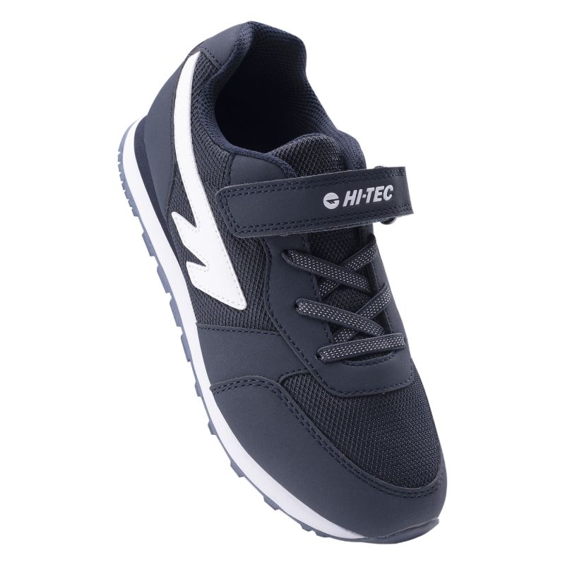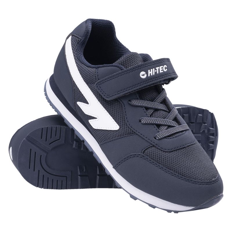 The ERNES JRG children's shoes by Hi-Tec feature a low-cut upper made from a combination of synthetic material and mesh, which improves breathability. The classic laces have been replaced with elastic bands, making putting them on easier. A single Velcro strap securely adjusts the upper to the foot. The EVA foam in the sole provides good cushioning, ensuring comfort. The classic color scheme will complement a variety of styles.