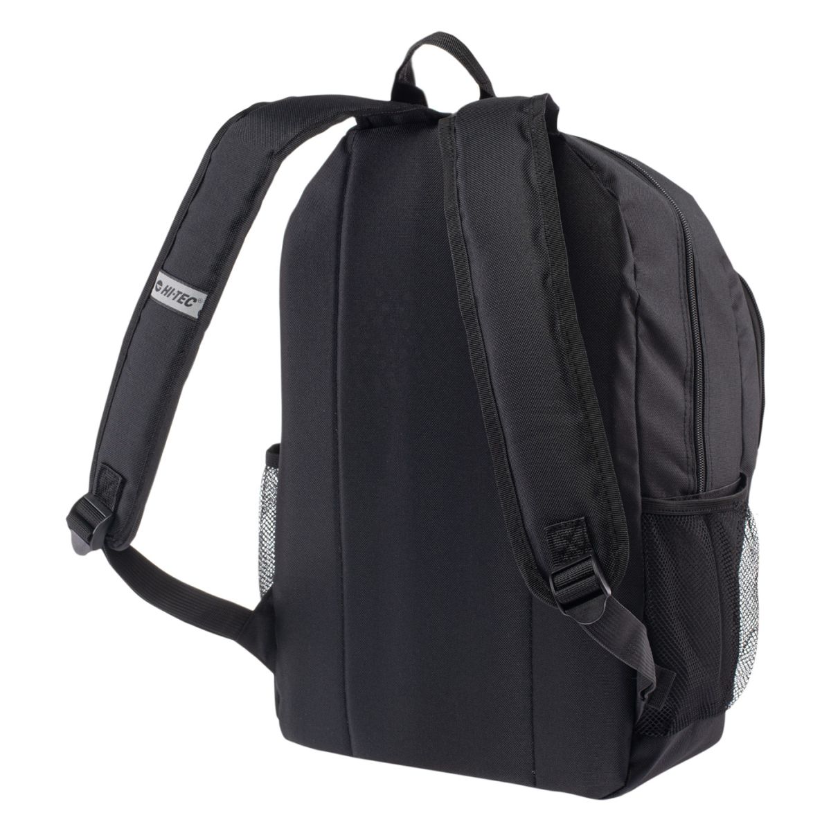 The black SKIPTON urban backpack by Hi-Tec features a spacious main zippered compartment, perfect for storing larger notebooks or a briefcase. An additional front pocket holds other essentials. Two mesh side pockets hold a thermal mug or water bottle. A large brand logo completes the look.