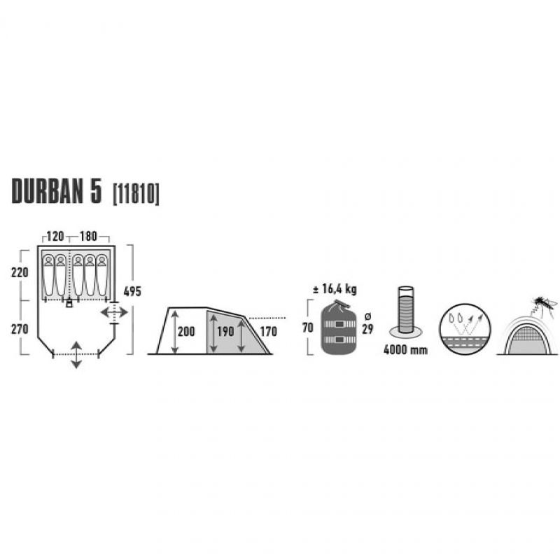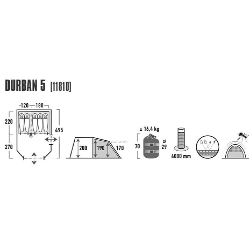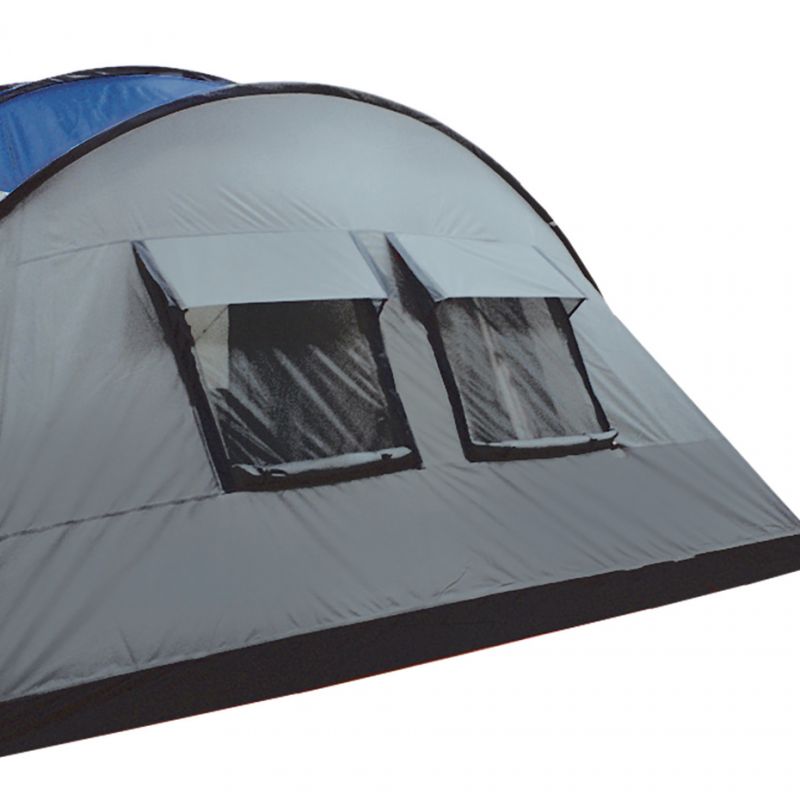 A 5-person tent with two entrances, a large vestibule, and two bedrooms. The High Peak tent features a vestibule with a groundsheet, two separate entrances, and steel poles that allow for a canopy over the entrance. Laminated seams and a 4000mm waterproof rating provide protection from rain. Ventilation holes ensure constant air circulation.