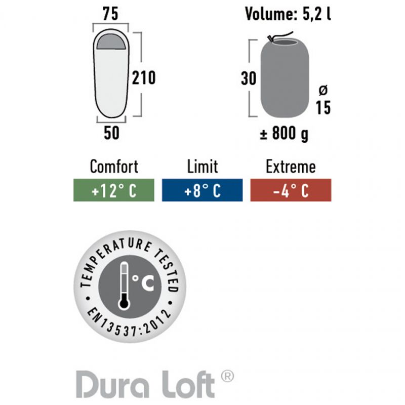- Parameters:- WEIGHT: ONLY 800 grams!!!- 2-way zipper- Inner pocket- Zipper insulation- Drawstring hood- High quality materials- Dimensions: 210x75x50 cm- Package dimensions: 30 x 15 cm- Outer material: 100% polyester- Filling: 1x150 g/m2 Duraloft, 100% polyester- Inner material: 100% breathable polyester